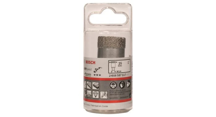 Bosch Diamantboor voor droogboren in keramiek. Geschikt voor zachte wandtegels tot zeer harde vloertegels en natuursteen. Voor gebruik op haakse slijpmachines.
