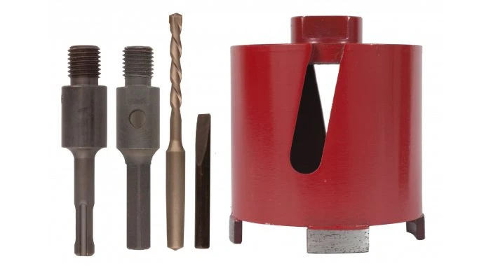 Droogboren in harde en middelharde steensoorten, uitgezonderd beton. Inclusief 13mm adapter, centreerboor (conisch) en spie.