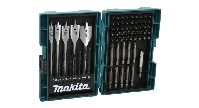 71-delige set met diverse maten speedboren, metaalboren, schroefbits en magnetische bithouder.