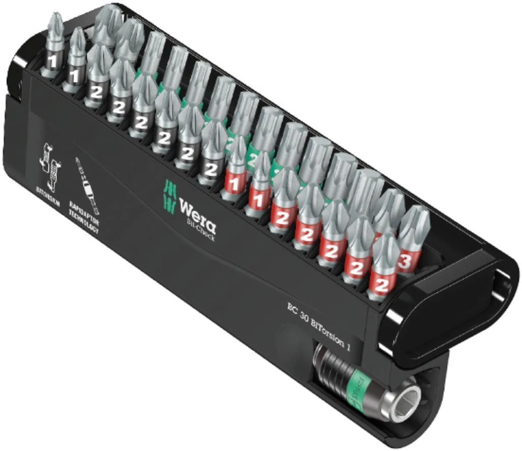 Robuuste Bit-Check van Wera met extreem harde bits, voor universeel gebruik. BiTorsion-bits met torsiezone, waarin bij belastingspieken kinetische energie wordt afgeleid. Met zachte BiTorsion-zone om torderen van de bit-punt bij hoge belastingen te voorkomen. Hierdoor wordt de levensduur van het product aanzienlijk hoger. Met bijpassende houder ter verlenging van de levensduur. Voorzien van Rapidaptor-technologie, om de bits te kunnen plaatsen zonder daartoe de huls te moeten bedienen. Om de bits weer te verwijderen, hoeft u de huls slechts naar voren te schuiven – zo kunt u bits zelfs met 1 hand razendsnel wisselen. Voor plaatsing van bits met 1/4โ buitenzeskant-aandrijving conform DIN ISO 1173-C 6,3 en E 6,3. Voor opname in de schroefmachine of in de boorkop van de elektronisch geregelde boormachine.
