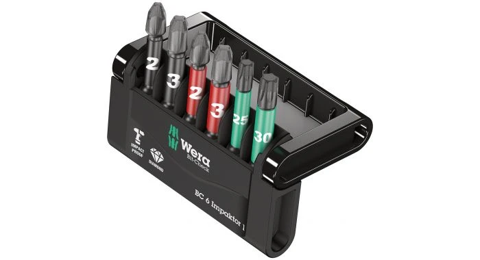 6 Wera Impaktor-bits, overzichtelijk en compact gerangschikt in handige Bit-Check. Bij de Impaktor-technologie wordt zo optimaal mogelijk gebruik gemaakt van de materiaaleigenschappen en is de geometrie volledig aangepast om langdurig gebruik mogelijk te maken, zelfs onder extreme werkomstandigheden. De bitpunt is voorzien van minuscuul kleine diamantdeeltjes die zorgen voor een hogere wrijvingsweerstand en zo het risico op wegglijden uit de schroef verkleinen.